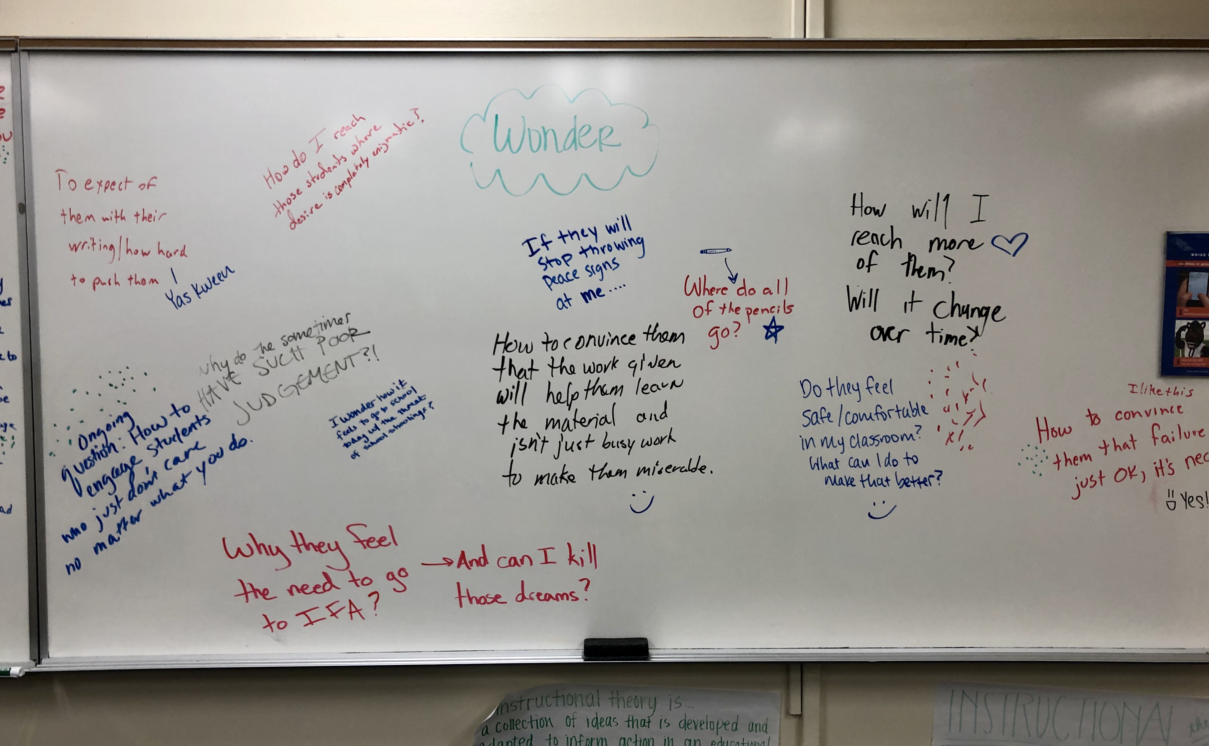 So last week, I took time to refocus on the ultimate teaching purpose: our students. I asked students in my graduate seminar to splash the whiteboard with reflections on their learner: What do you Know about your students? What do you still Wonder? What do you Wish for your students?